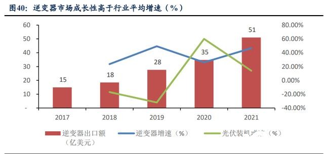 逆變器市場成長性高于行業(yè)平均增速。在全球光伏產(chǎn)業(yè)大發(fā)展的推動下,光伏逆變 器市場近年來保持了較快的發(fā)展態(tài)勢。2017 年以來全球光伏逆變器出貨量快速上漲,出 口額從 2017 年的 15 億美元上升到 2021 年的 51 億美元,年復(fù)合增長率達到 35.9%。逆 變器成長性高于光伏行業(yè)平均增速。