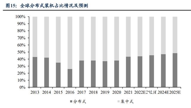 美國:加州強制安裝光伏系統(tǒng),分布式占比有望提升。2017-2019 年美國分布式光 伏裝機增長有所放緩,但美國加州于 2019 年出臺政策要求從 2020 年起對三層以下新建 建筑強制安裝光伏系統(tǒng),2021 年美國分布式光伏裝機達 6.6GW,同比增長 18%,我們 預(yù)計未來分布式光伏裝機持續(xù)快速增長,分布式占比有望提升。 歐洲:分布式占比較為穩(wěn)定,保持高速增長。歐洲分布式占比較為穩(wěn)定,2021 年約 為 59%,2021 年歐洲分布式裝機量約 15.2GW,俄烏沖突下居民電價高漲,歐洲分布式 需求旺盛,我們預(yù)計 2022 年歐洲分布式光伏將持續(xù)增長,占比或提升至 70-80%,對應(yīng) 2022 年裝機達到 35GW 以上,實現(xiàn)翻倍多增長。
