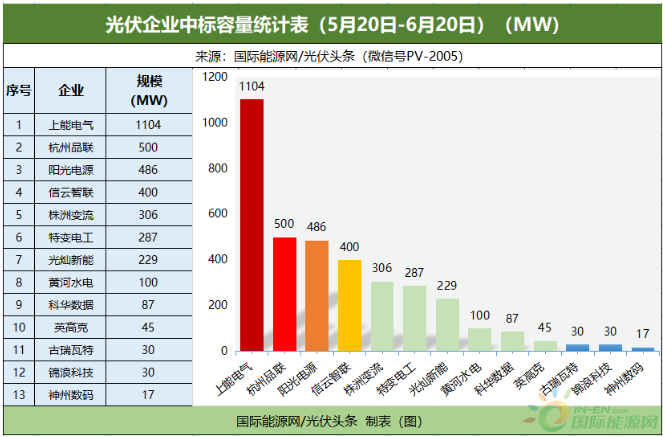 國際能源網/光伏頭條(PV-2005)統計,國內招標市場上,5月下旬以來,杭州品聯、陽光電源、上能電氣、特變電工、株洲變流技術等17家企業,共同贏得了9.57GW的逆變器招標采購訂單。