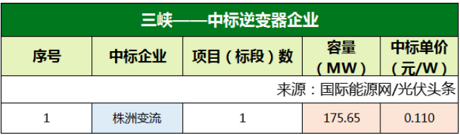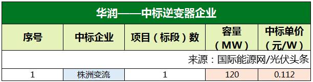 三峽集團、華潤兩大央企各自定標1個逆變器采購項目,容量分別為175.65MW、120MW。株洲變流技術成為最大贏家,全攬這兩個項目。