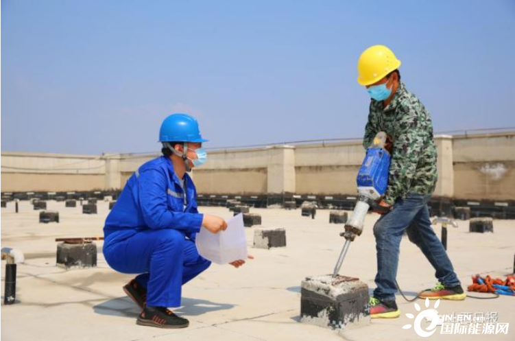 ▲ 在華能屋頂光伏發電項目施工現場,工人對光伏組件混凝土基礎設施進行施工。