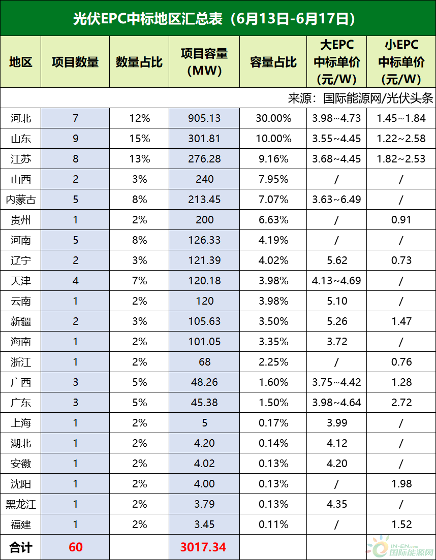國際能源網/光伏頭條(PV-2005)對6月第3周(6月13日-6月17日)光伏EPC招/中標項目不完全統計,本周招標規模合計3556.14MW,中標規模3017.34MW,招中標規模合計6573.48MW。此外,本周多晶硅、電池片紛紛上漲,組件龍頭企業加速產業鏈垂直一體化,同樣值得關注!