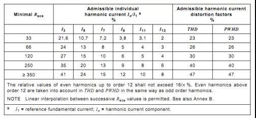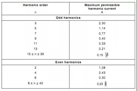 當逆變器的額定電流I≤16A時,根據(jù)IEC61000-3-2標準,各次諧波電流的限值如下表所示: