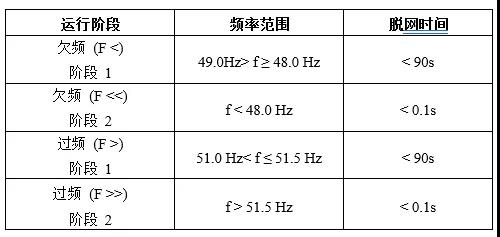 當電網(wǎng)頻率超過光伏逆變器的正常運行范圍時,逆變器應在規(guī)定時間內脫網(wǎng),以保證設備的安全運行。逆變器應具備足夠的頻率測試精度,以便于及時偵測到電網(wǎng)頻率的異常,并在電網(wǎng)頻率異常的情況下執(zhí)行保護動作。過/欠頻保護采取二級保護策略,不同過/欠頻下,光伏逆變器的脫網(wǎng)時間如下表所示: