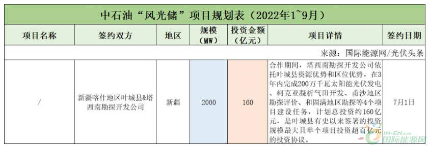截至2022年9月30日,中石油共簽約(規劃)1個風光儲項目,明確規模共計2GW,明確投資金額160億元。